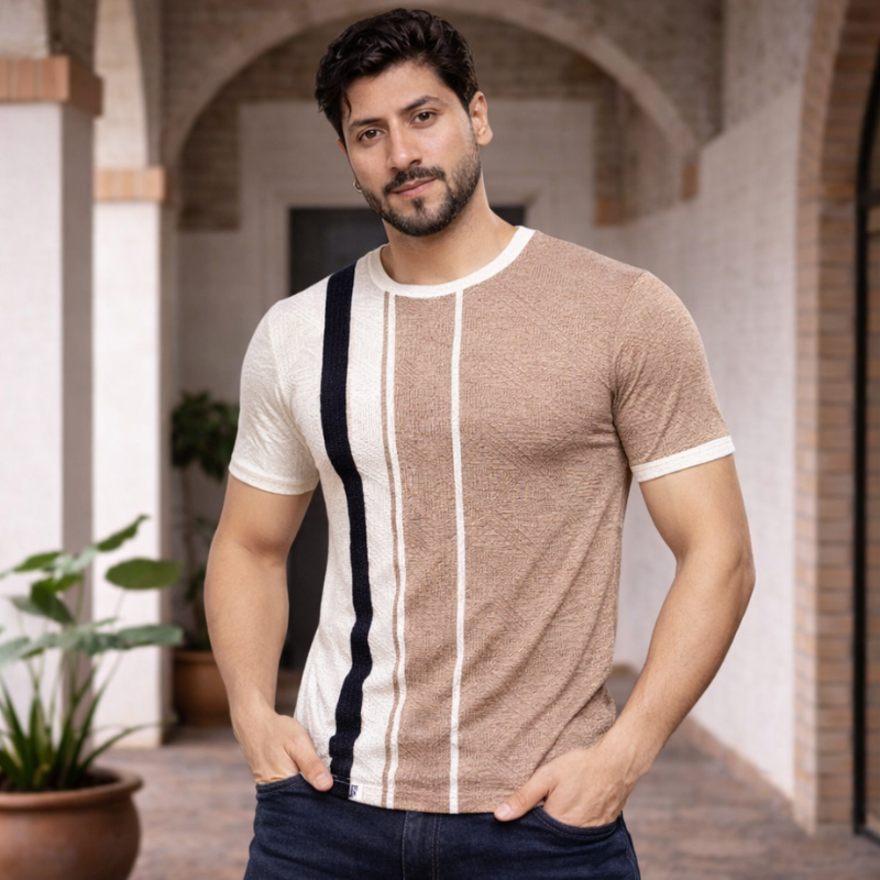 Make a statement with this beige colorblock t-shirt for men, featuring a modern striped design, slim fit, and soft textured fabric for a refined casual style.