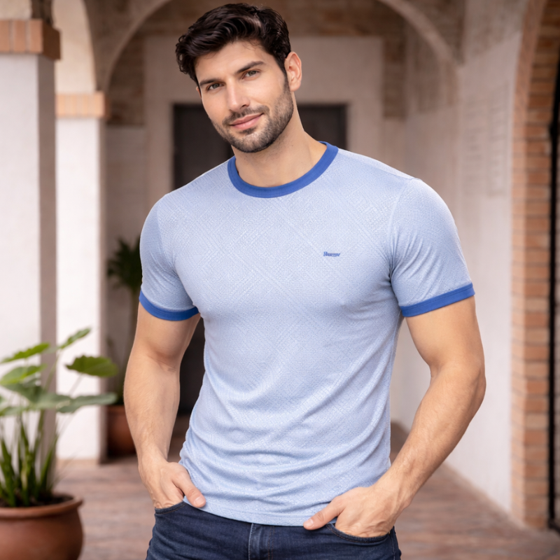 Upgrade your everyday style with this light blue textured t-shirt for men. Featuring a slim fit, soft fabric, and subtle pattern for a refined casual look.