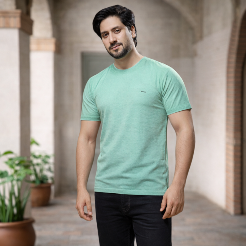 Fresh, refined, and effortlessly stylish, the Mint Grid Comfort Tee is designed for men who appreciate subtle details. Crafted with a textured geometric grid knit, this T-shirt offers a breathable, smooth feel with a structured silhouette. Clean from the front and refined at the back, it’s an everyday essential that looks polished from every angle.